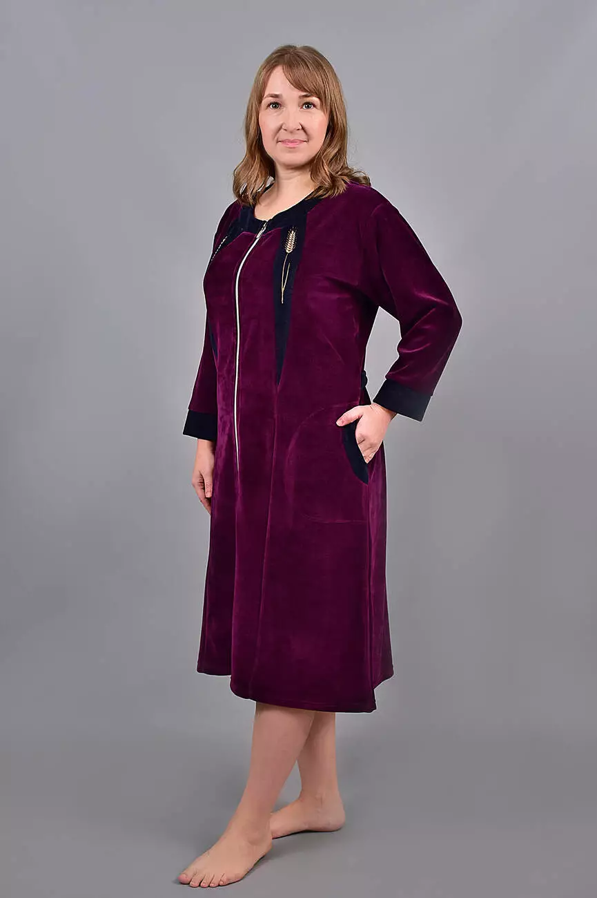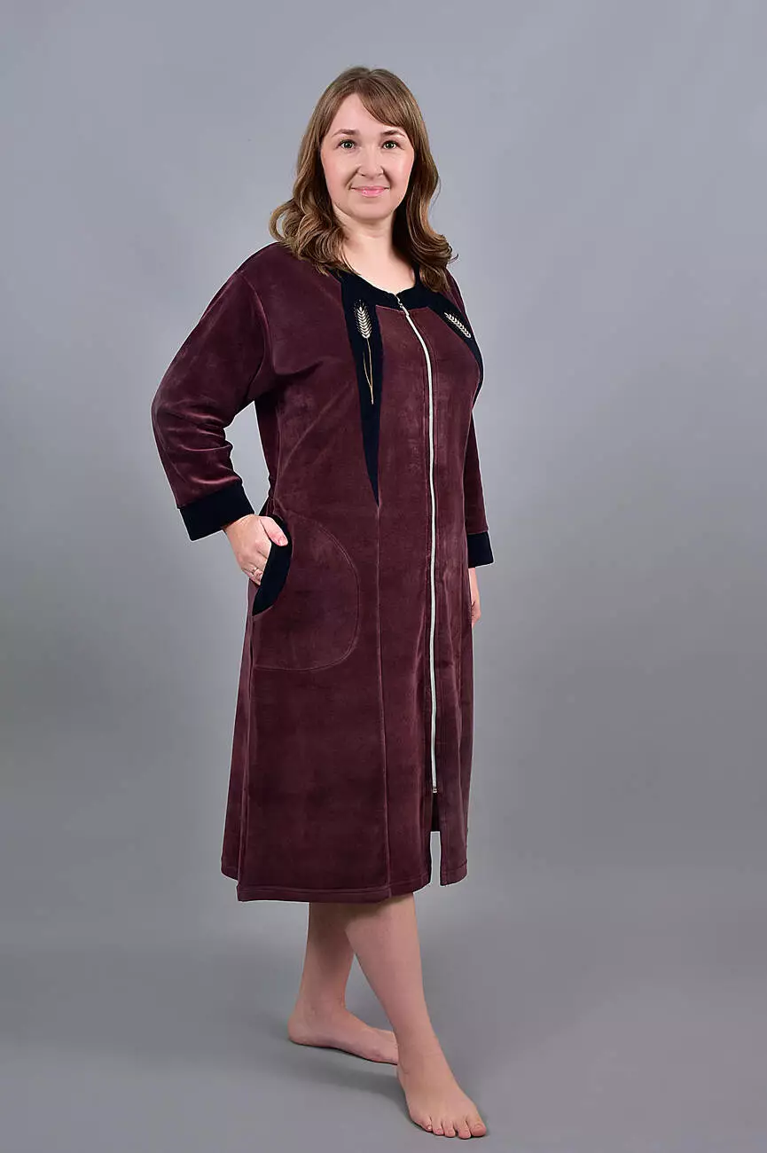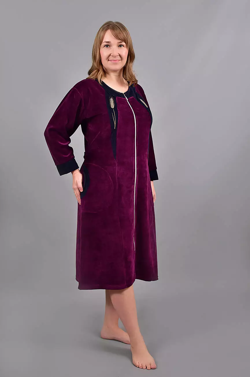 Модель халата однотонна з вишивкою на грудях і бічними кишенями. Халат на блискавці.