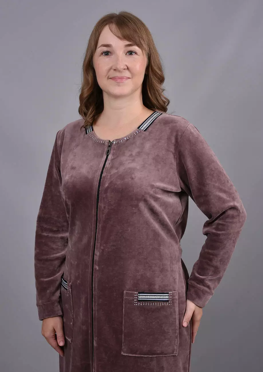 Про тканину: Бавовняний велюр - надзвичайно м'яка та приємна на дотик, матова трикотажна тканина. З лицьового боку з короткими ворсинками, з виворітного - гладка. Матеріал добре «дихає», гігієнічний. У складі тканини є еластан, завдяки йому тканина добре тягнеться і ідеально підходить для домашняго одягу.