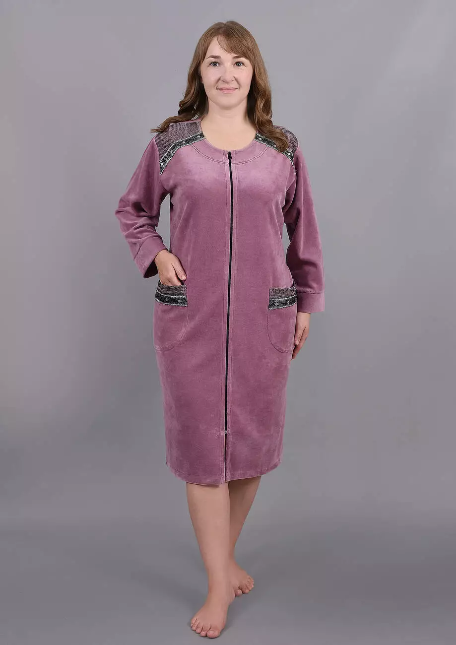 Модель халата однотонна з вишивкою на плечах і накладними кишенями. Халат на блискавці.