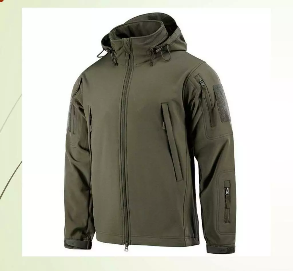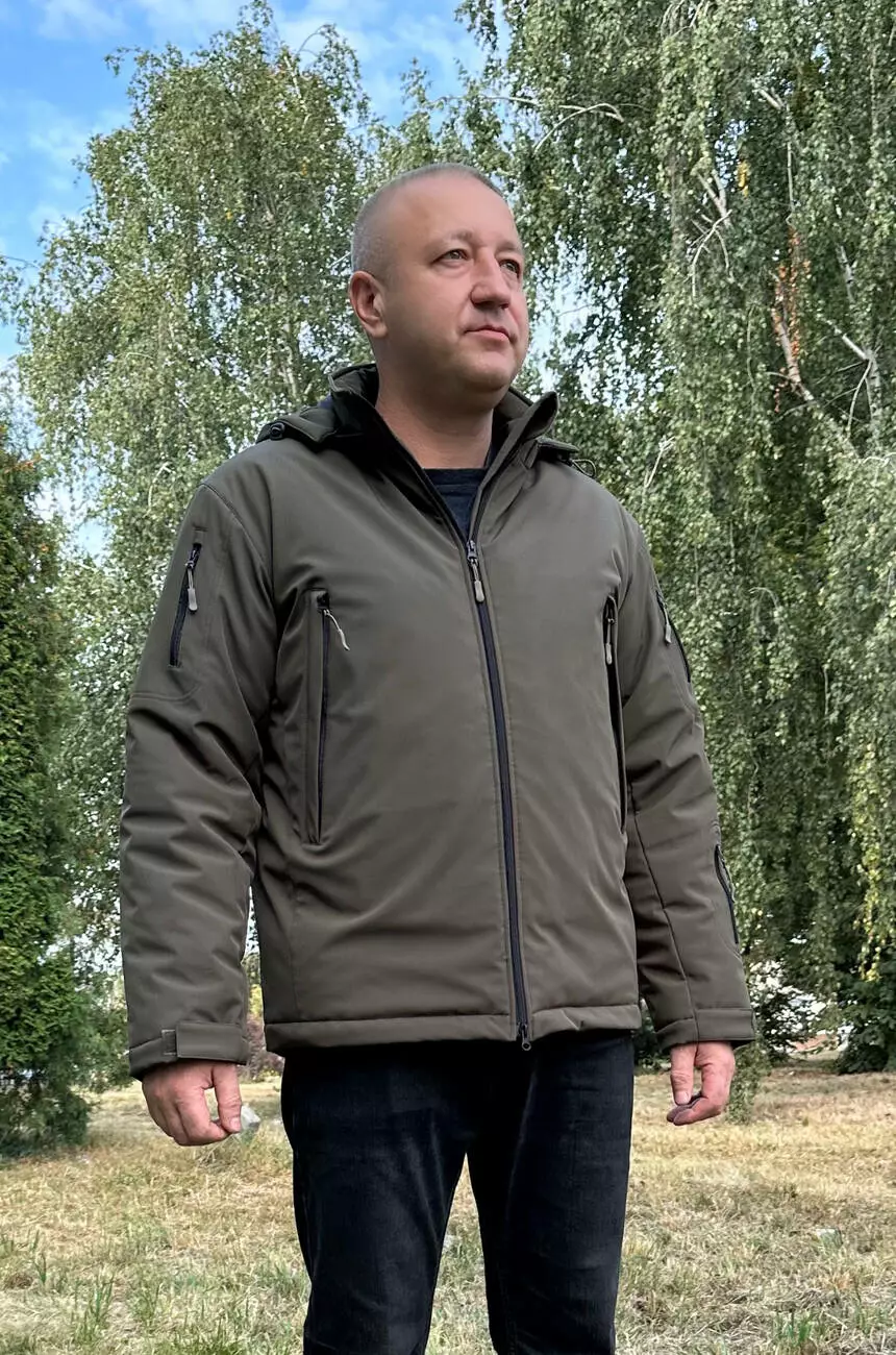 Куртка   виконана із тканини  «Softshell»  тришарової з мембраною покриттям в кольорі темна олива, поверхнева густина -270 г/м2, водонепроникність-19 090 мм.вод.ст..
