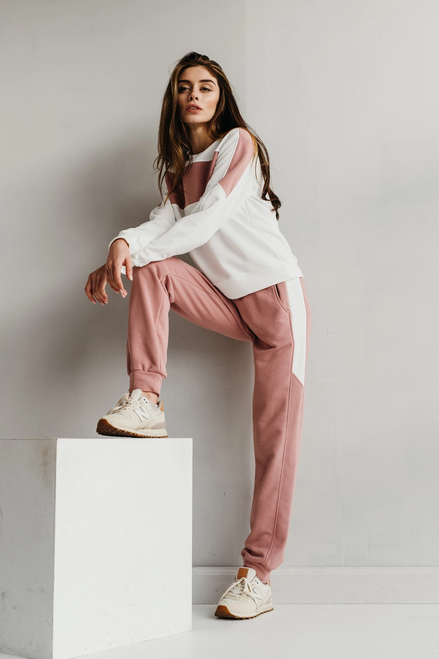 Теплий костюм із світшотом та штанами із високою посадкою талії на зручній резинці. Поєдання двох кольорів тканини із контрастними вставками.Розмір - роздріб - 44